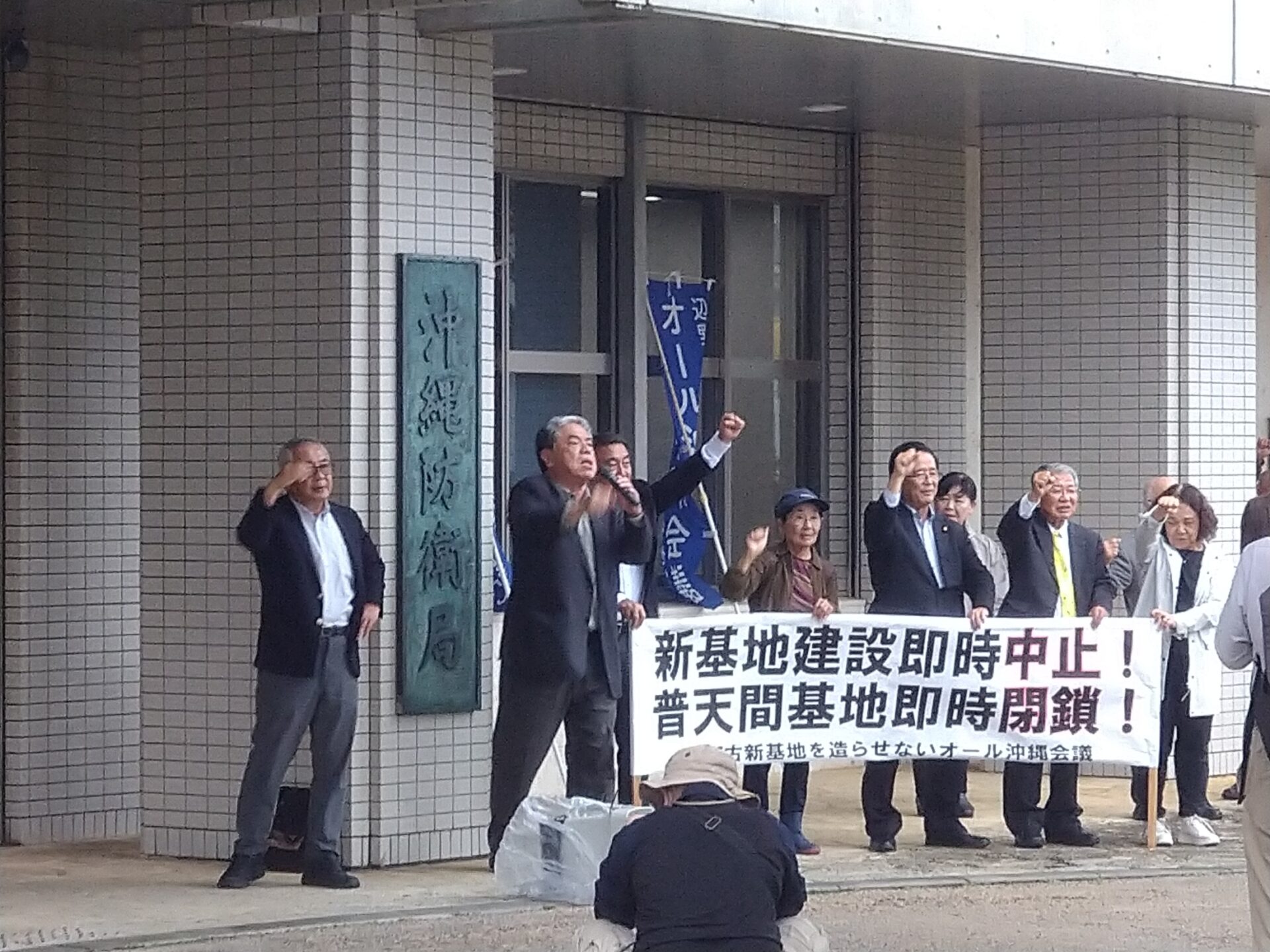 2月27日、オール沖縄会議による沖縄防衛局長への申し入れ行動&抗議集会が行われました。米国防総省の「辺野古基地が完成しても、別の長い滑走路を確保しない限り普天間を返還しない」という公式見解に接し、新基地建設の即時中止と普天間基地の即時地閉鎖・返還を求める要請行動です。沖縄防衛局前約100人が集まり、事前集会の後、伊波洋一参議院議員とともに代表団が村井勝局長と面談しました。